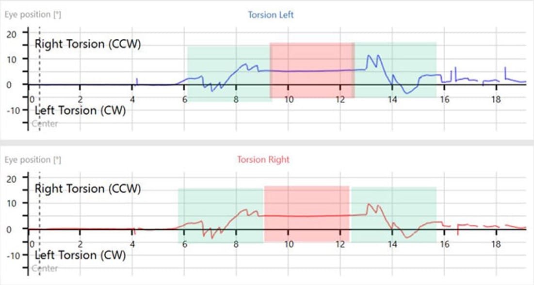 Baş yana doğru eğildiğinde, gözlerin karşı yönde küçük bir rotasyon hareketi yapması beklenir. Bu rotasyon, baş eğilse bile görsel alanın mümkün olduğunca sabit kalmasını sağlar. Bu refleks hareket, gözlerin yatay düzlemdeki stabilizasyonunu sağlar ve otolit organlarının (özellikle utriculus) işlevselliğini gösterir.